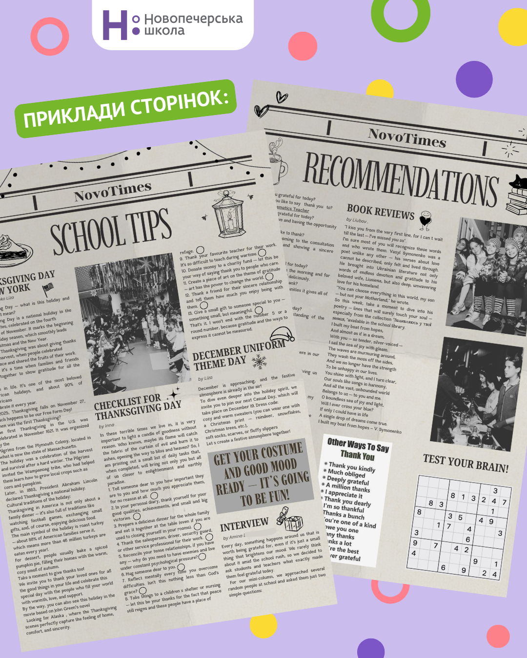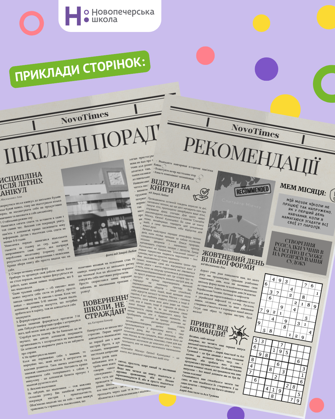 Шкільна газета у Новопечерській - це чудова можливість для учнів 10-11 класів практикувати свої навички письма, командної роботи, а також приміряти профілі журналіста та редакції.