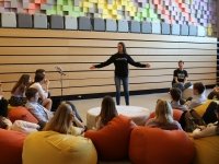 Перше, що мені сподобалось – це невимушена атмосфера вистави. Я не сильно люблю офіційні заходи, тому розповідь складного твору на м’яких пуфах - для мене найкращий варіант. Великим плюсом були ще й смачні бутерброди з салом, які доповнювали розповідь. Цікаво було бачити акторів прямо перед собою, бачити як змінюються їхні риси обличчя та емоції, спостерігати за тим, як вони взаємодіють між собою та виступають як згуртована команда. Друге – це стиль розповіді твору. Сюжет переказують, наповнюючи цікавими сценками, жартами та іронією. Важливою частиною є ще й взаємодія з глядачами. Актори залучають спостерігачів до своїх сценок й вони грають певну частину сюжету разом. Мені найбільше запам’яталося, коли покликали хлопця, щоб він зображав титаря, у якого вибивали гроші. Актори одягнули хлопцю мішок на голову й по-різному “знущалися” з нього тортурами того часу. Завдяки такій взаємодії глядачів і акторів вистава не стає нудною й деталі краще запам’ятовуються. Єдиним мінусом, який я виніс для себе — це не дуже інформативний виклад сюжету, адже в деяких моментах жарти та сценки затуляють суть самого твору. Через це по закінченню, я не до кінця розумів про що був твір «Гайдамаки». Загалом, я б порадив цю виставу людям, які люблять нестандартні театри. Це чудова можливість дізнатися багато нового про творчість Тараса Шевченка та гарно провести час, не навантажуючи себе великою кількістю інформації.