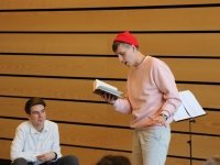 Нещодавно до нас у школу приїхали актори, аби показати учням нову інтерпретацію твору “Гайдамаки”. Труппа складалась з трьох акторів, але вони активно взаємодіяли з глядачами, тому їх також можна назвати членами групи. Перш за все, хочеться зауважити, що актори обрали нетипову ділянку для своєї вистави. Замість того, щоб виступати на сцені актової зали, вони розмістили пуфи і подушки навколо вільної місцевості в самому залі, створивши таким чином імпровізовану сцену. Особисто для мене, це був хороший і крок і вдалий приклад осучаснення театру. Таке розміщення дало акторам можливість краще взаємодіяти з глядачами та використовувати весь простір приміщення як одну суцільну декорацію. Перейдемо ж до суті. Задум подібної інсценізації полягав не у відтворенні всього сюжету з його деталями і темними кутами, а, скоріше, ознайомити і зацікавити молодиків у класиці української літератури. Цей висновок було досить просто зробити, адже актори сказали про це на самому початку дійства. Свій виступ вони наповнили великою кількістю жартів та інсценізацій за участі школярів, також часом були цитовані частини самого твору, і один раз група роздала глядачам смачні канапки з томатним соком. Як на мене, це досить цікавий спосіб постановки легендарної і класичної поеми через призму сучасного світосприйняття, адже справді багато різних подій, які наповнювались жартами та вставками, привертають увагу. Реакція залу була досить очевидною і легко передбачуваною. Як же можна не сміятись, якщо твого друга ставлять на коліна, зав’язують руки, одягають сумку на голову і підколюють в різний спосіб, аби краще показати мордування звичайних жителів конфедератами. Як можна не посміхатись, якщо великого й могутнього світила української літератури, про якого захопленням розповідала вчителька, дивлячись на портрет вгорі, показує молода і симпатична дівчина, використовуючи власні коси, як вуса. Чим двоє акторів і акторка можуть пишатись, так це створенням комічного ефекту. Сміялися справді всі, навіть вчителі і представники адміністрації. Але є й інша сторона в цієї медалі. За цим іронічним методом подачі, було складно вловити і осягнути, чому ж цей твір є таким величавим, чому цей твір — класика. Як на мене, вистава не змушує юних глядачів взяти до рук книгу і почати читати, і не просто шукати пікантні моменти в книжці, на які так активно звертали увагу актори, а й розуміти соціальну і політичну ситуацію в ті часи. Ці жарти з іронією вже наповнюють собою весь твір і чітко з ним асоціюються, не розкриваючи його зовсім з іншого, серйозного боку. Смішинок дітям достатньо для ознайомлення, вони не мотивують прочитати твір, не ставлять цікавих та контроверсійних понять, а дають просто посміятись і забути. У підсумку, на мою думку, такий тип театрів має право на життя і навіть може бути корисним, але тільки у випадку, якщо вистава буде наповнюватись цікавими дійствами, не просто смішними. Варто більше вставляти інформаційних відрізків, які ставлять саме інтригуючі питання, відповіді на які ми зможемо знайти в тексті. Це моя порада, і мені здається, якщо поєднати такий стиль подачі з вищезазначеними змінами, то вийде подолати нелюбов молоді до читання.