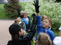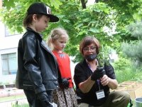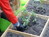 Одягнувши магічну чорну рукавичку, діти обирали собі підопічного (огірок, перчик, помідор або квітку... хоча дехто з учнів просив банан!) та відправляли з пластикового горщика в доросле життя, тобто у великий дерев'яний ящик. Тепер діти матимуть доглядати за рослинками і щодня їх поливати. Якщо, звісно, дощик не візьметься їм допомагати ![]()